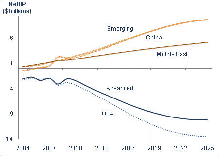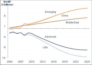 This chart shows projected international investment position (IIP), a financial statement setting out the value and composition of that country’s external financial assets and liabilities, over the next 15 years.