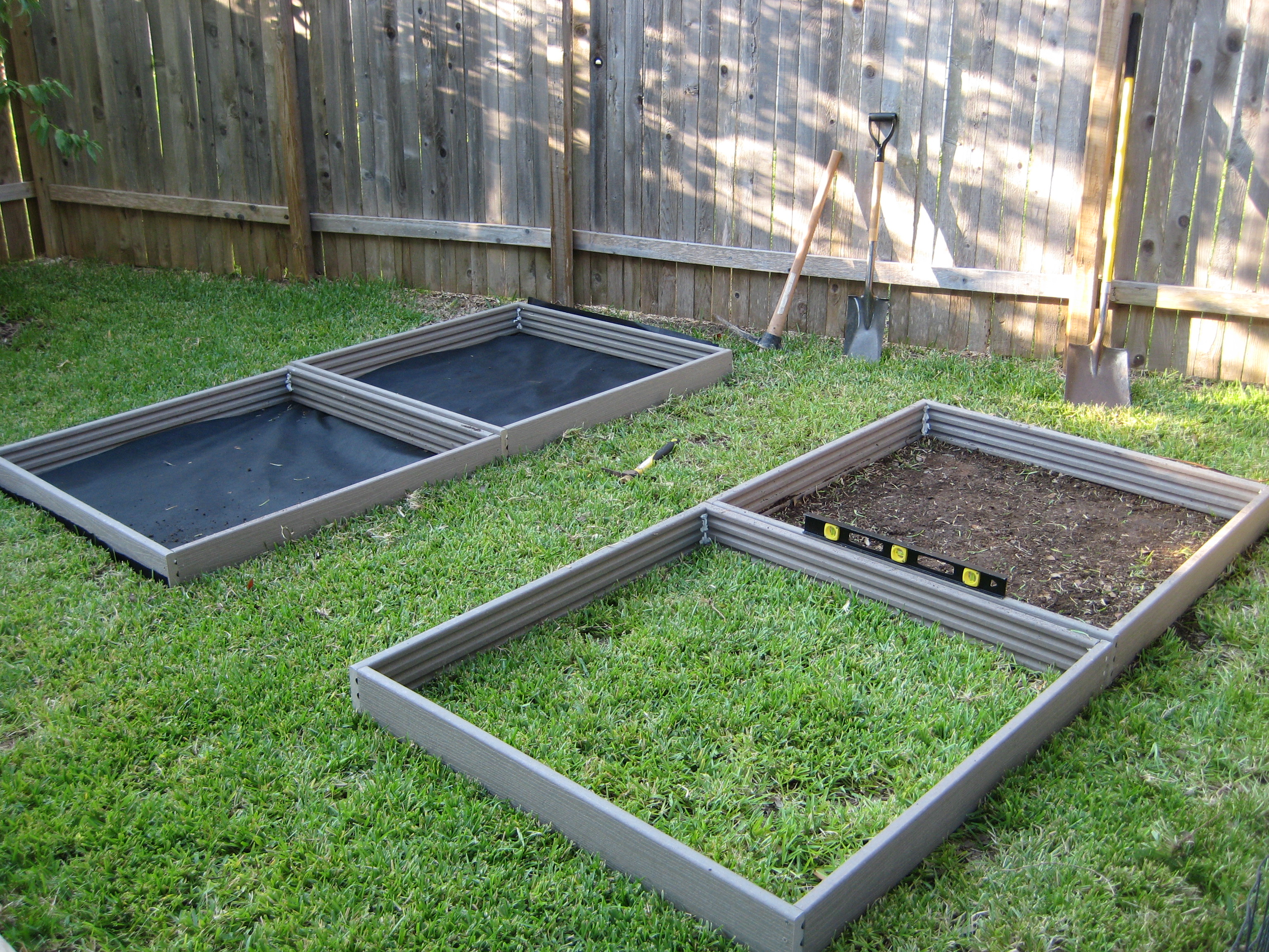 Raised beds in various phases of being installed.