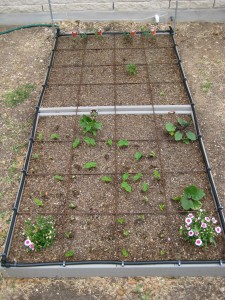 The next key technique used in Square Foot Gardening is placing a permanent 12-inch by 12-inch grid over each raised bed. The fully-grown size of each plant determines how many can be grown in each square. For example, in any given square, you could plant 1 tomato plant, 9 green bean plants, or 16 carrots. You can use strips of wood or string to make these grids but I chose to install drip irrigation lines to use as both my grid and to optimize the watering of the beds.